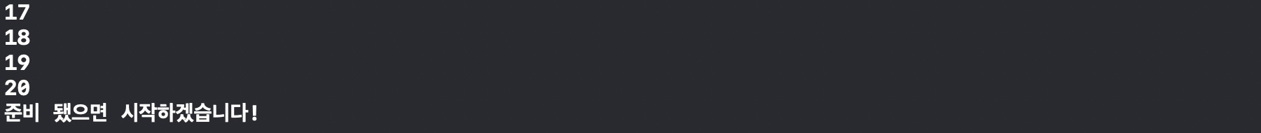 예를 들어, 우리는 1부터 20까지 카운트 한다음 마지막에 "준비 됐으면 시작하겠습니다!" 라는 텍스트를 출력 하려고 합니다. 그렇다면 아래와 같이 While문을 사용하면 됩니다.