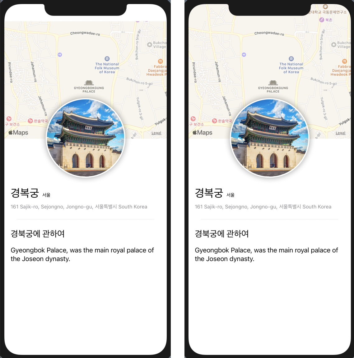 세번째, 상세뷰를 Spacer() 을 사용하여 위쪽으로 배치 시켜 주고, SafeArea부분도 채워줍니다.