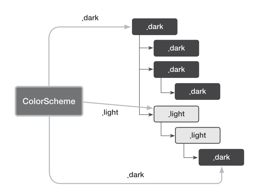 위 그림을 보게 되면 ColorScheme을 최상위 뷰에 dark로 지정하면 그 자식 뷰 들은 자동으로 DarkMode가 됩니다. 하지만 자식 뷰 중 하나에 light 값을 주게 되면, 해당 뷰와 그 뷰의 아래 있는 뷰는 LightMode가 기본값이 됩니다. 이렇게 SwiftUI의 각 환경 요소는 뷰 계층 구조에 영향을 받으며, 동적으로 제어할 수 있습니다.