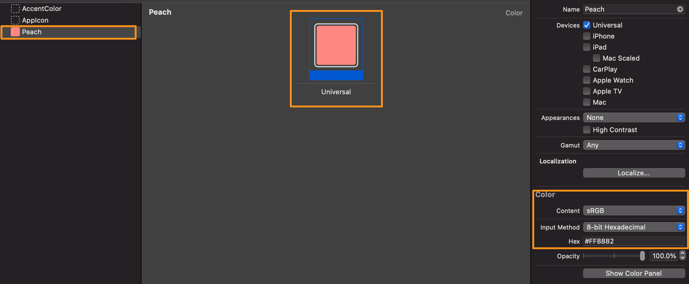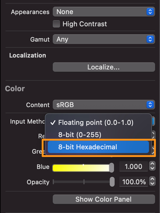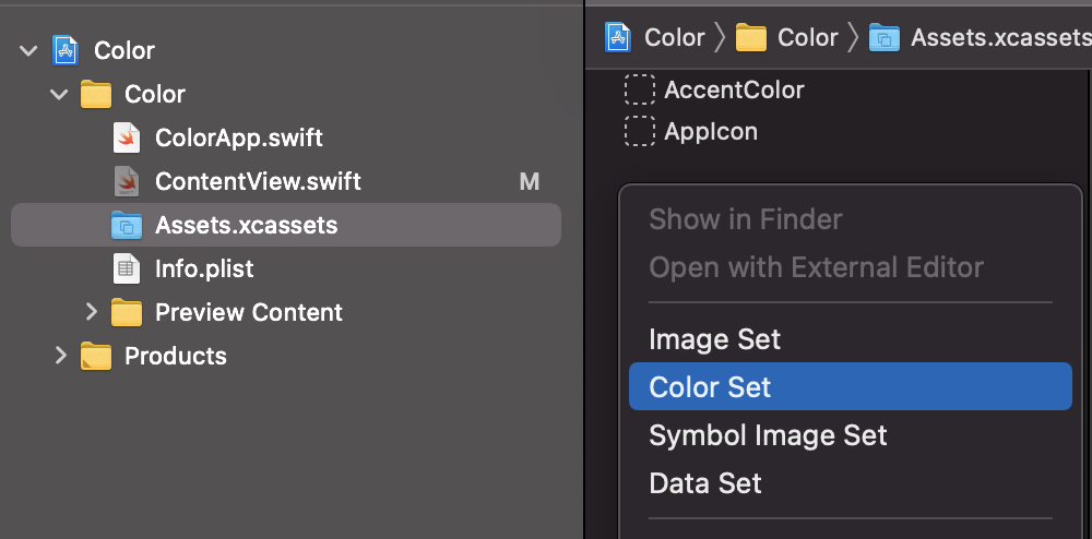 위처럼 익스텐션을 따로 만들어서 핵스코드를 넣어줄 수 있지만, 간단하게 Assets에 hex코드를 등록해서 사용할 수 있습니다.