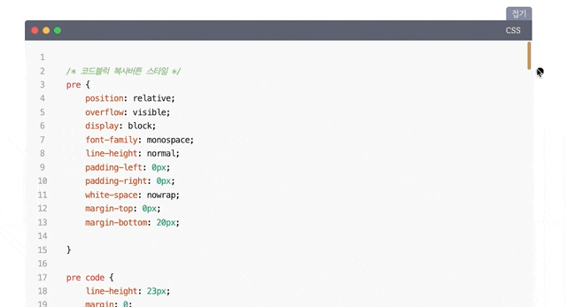 하지만 코드를 자주 사용하는 블로그인 경우 아주 난감합니다...! 그렇기에 Copy & Paste 버튼이 거의 필수적으로 필요하죠. 코드 블록의 오른쪽 상단에 복사 버튼을 추가해서 사용자가 직접 드래그 복사하지 않고 편리하게 이용할 수 있도록 설정해 보도록 하겠습니다.