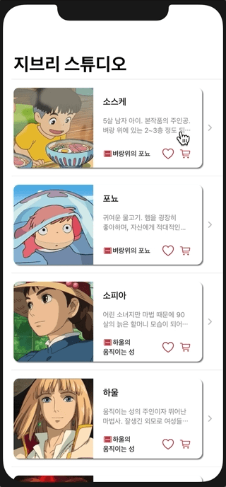 를 설정해서 화면을 구현해봤습니다. 이번에는 리스트를 이용하여 전체 캐릭터 정보 목록을 나타내고, 강 상품의 상세화면으로 들어가 보기까지 해보겠습니다.
