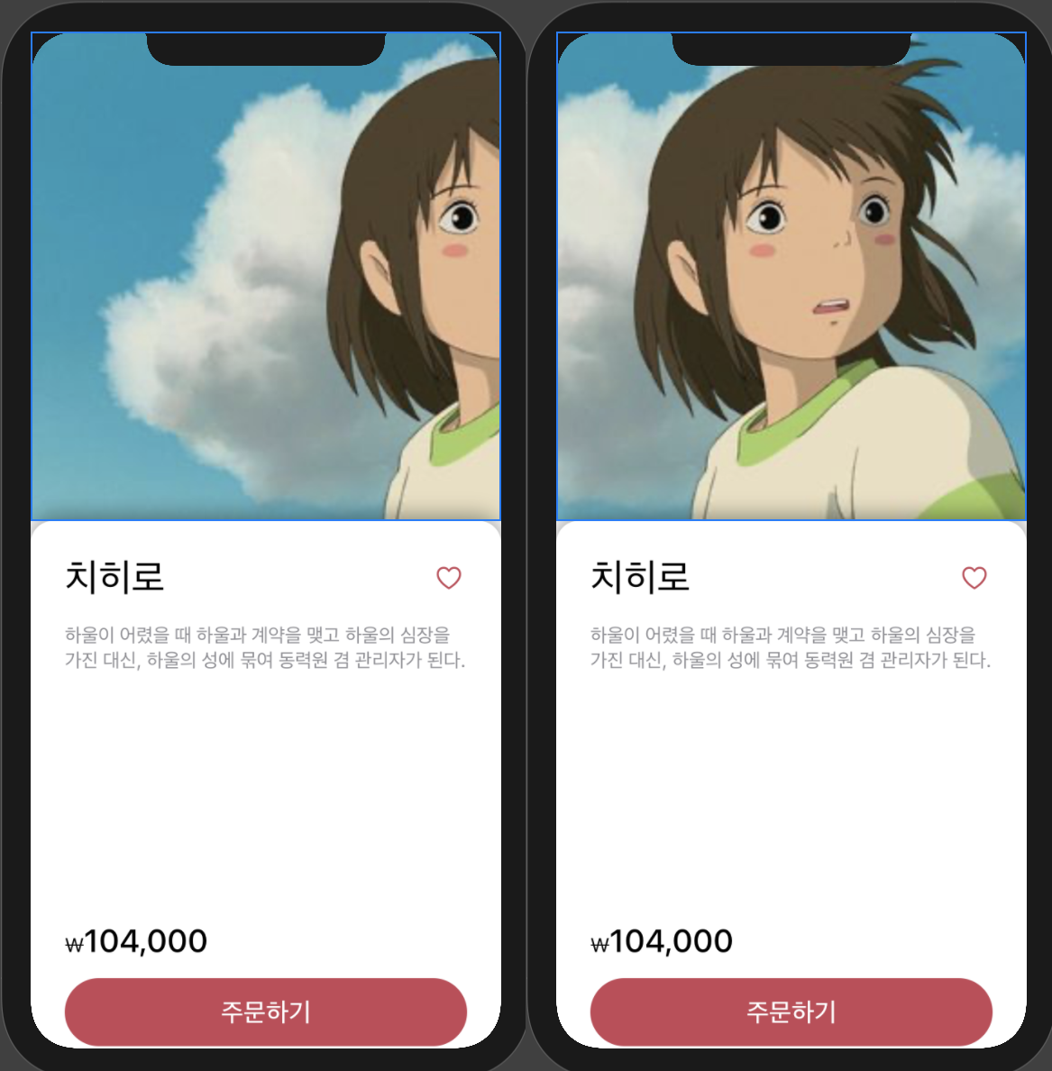 // ProductDetailView.swift private extension ProductDetailView { var productImage: some View { Image(self.product.ImageName) .resizable() .scaledToFill() } } var orderView: some View { GeometryReader { VStack(alignment: .leading) { self.productDescripsion //영화제목과 즐겨찾기 버튼 이미지 추가 Spacer() // 아래 코드는 잠시 주석 처리 // self.priceInfo // 가격 // self.orderButton // 주문버튼 } .frame(height: $0.size.height + 10) .padding(30) .background(Color.white) .cornerRadius(20) .shadow(color: Color.black.opacity(0.4), radius: 10, x: 0, y: -5) } }