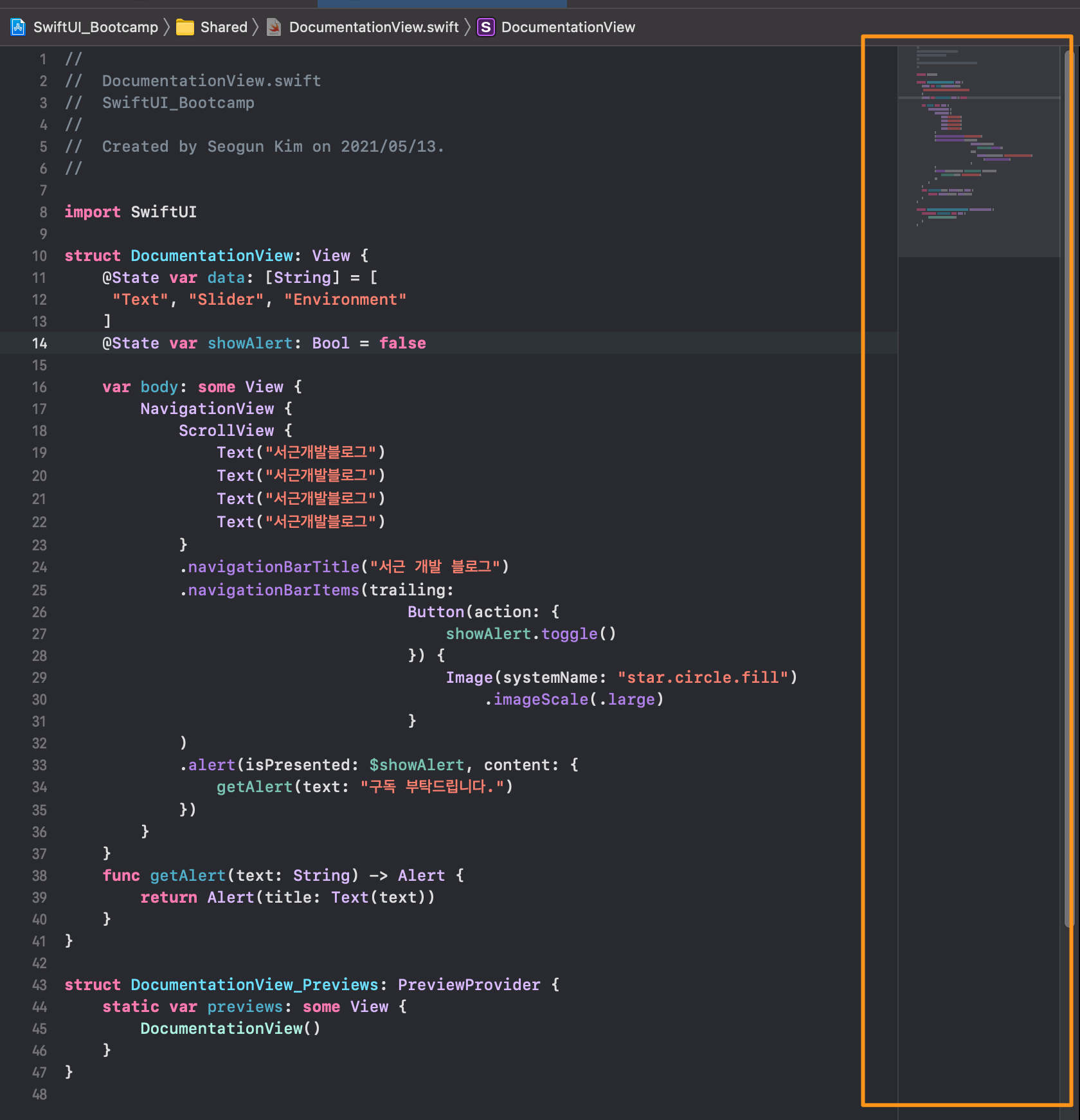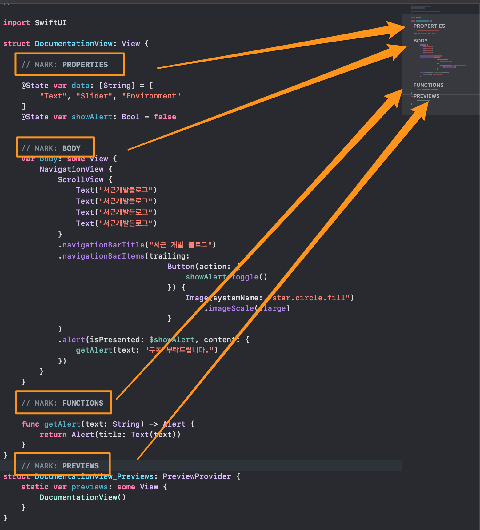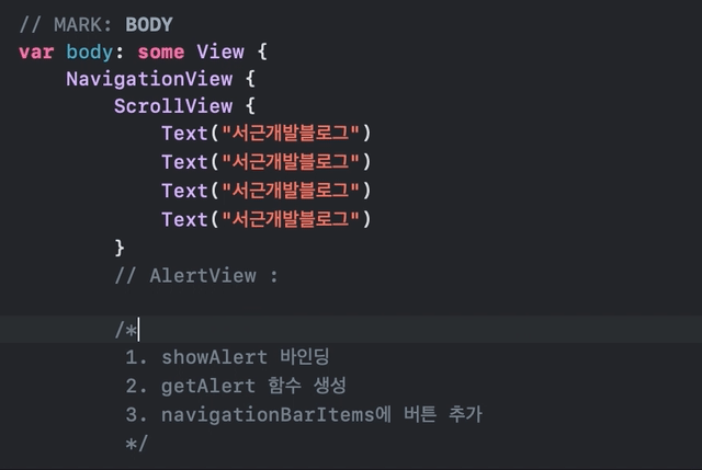 코드를 살펴보면 Body가 최상단에 있고 그 아래에 Function 함수구 그아래에 Previews가 있습니다. 이것을 주석을 달아서 메모를 하거나 위치를 알기 쉽게 만드는 것이죠. 많은 언어에는 각자의 언어에 맞는 주석처리 방법이 있습니다.