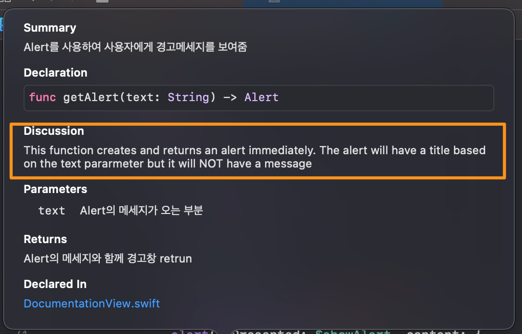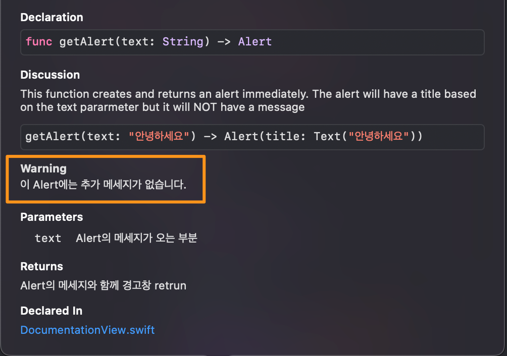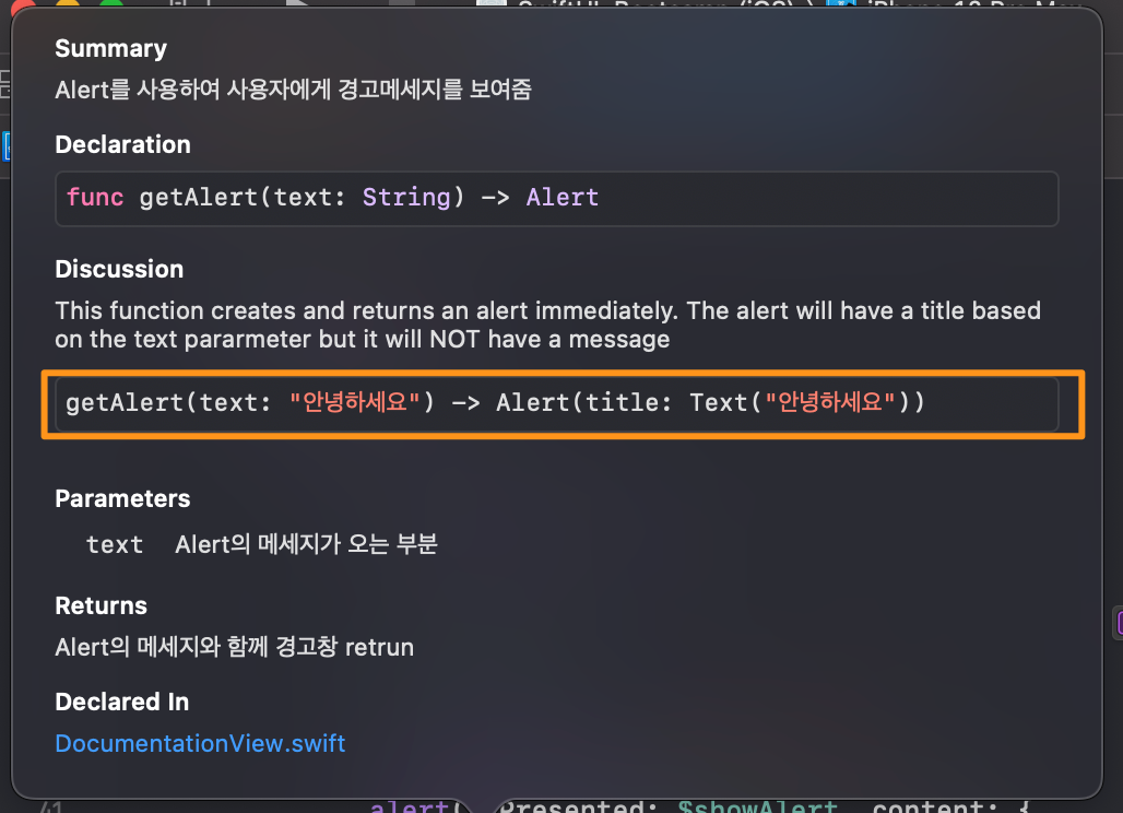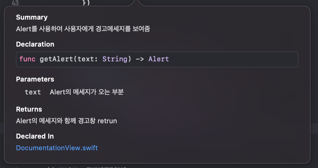 자 이렇게 Documentation을 작성해놓고 body의 alert로 가서 ⌥+클릭을 해보겠습니다.