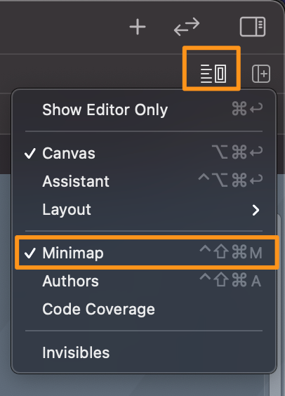 Xcode에서는 바로 // 입니다. 우선 Xcode의 미니맵을 활성화해주겠습니다. 단축키로는 ⌘ + ⌃ + ⇧ + M 을 눌러서 활성화하거나 아래 경로처럼 직접 선택해 활성화할 수 있습니다.