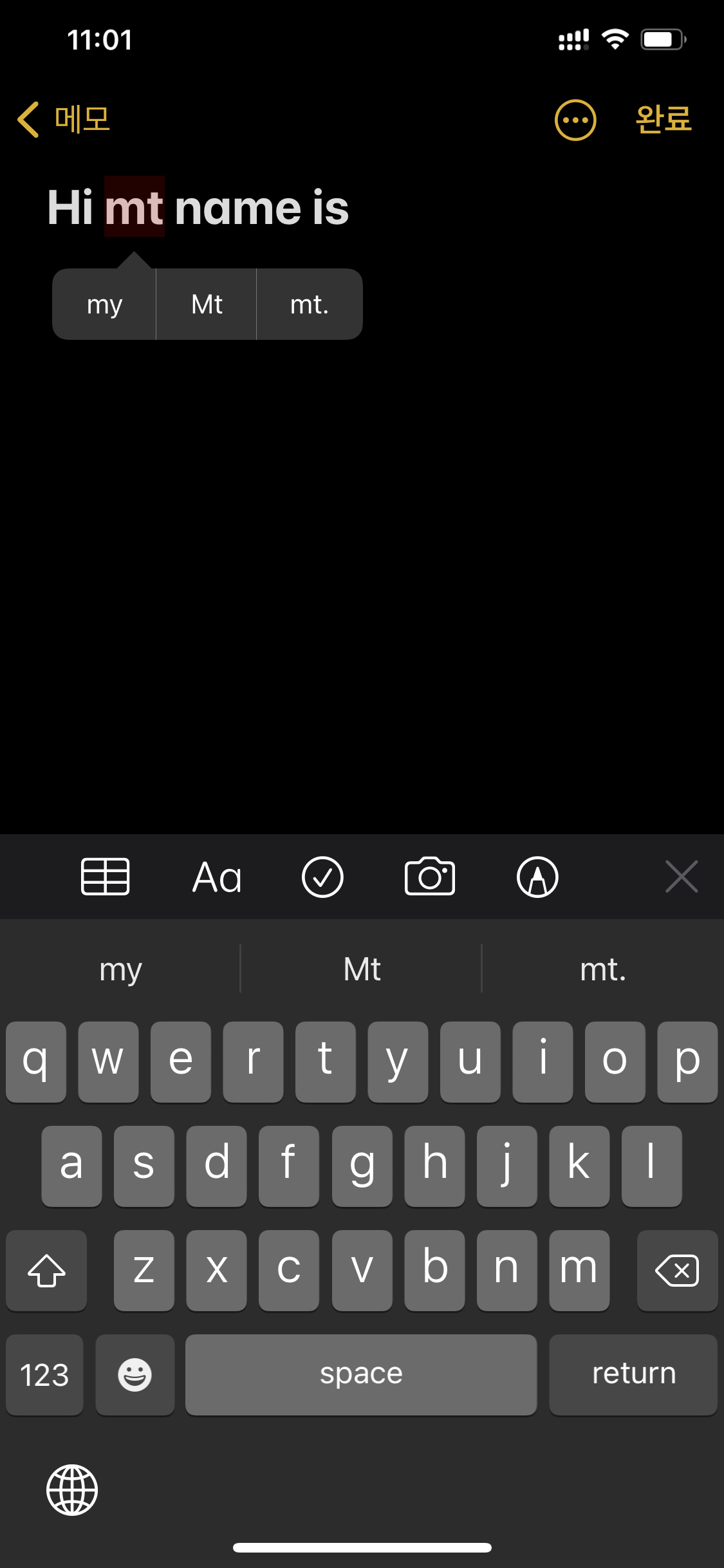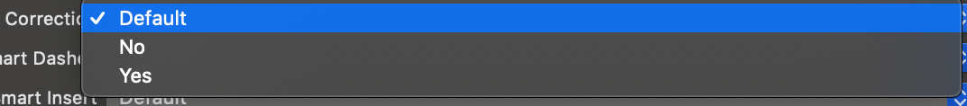 키보드 옵션의 자동 수정이 off 이면 autocorrection을 Yes로 해놔도 설정에서 off를 했기 때문에 이 Yes가 무시된다.