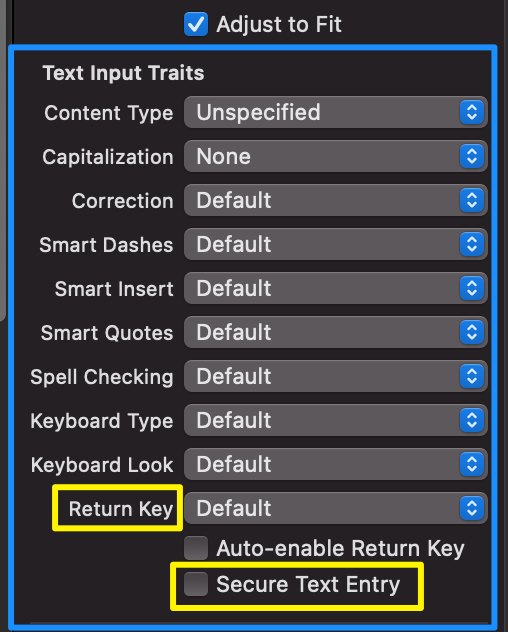 UITextField객체에서 이 프로퍼티를 true로 설정하면, 입력한 텍스트가 가려지는 비밀번호 스타일 환경이 추가로 활성화된다.