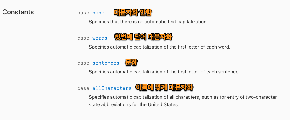 대문자와 관련된 프로퍼티. 일부 키보드 타입은 auto-capitalization을 지원하지 않는다. 특히 keyboardType프로퍼티의 값이 numberPad, phonePad, namePhonePad로 설정된 경우, 이 옵션은 무시됨.
