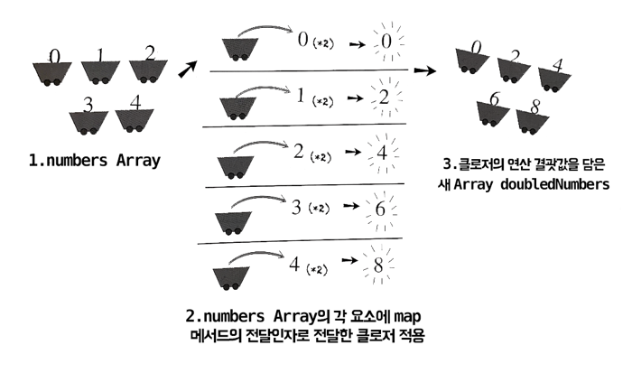 위에서 'map 메서드와 for-in 구문의 차이점은 코드의 재사용이나 컴파일러 최적화 성능 차이이다.'라고 언급했었는데, 코드의 재사용 측면에 대해 알아보자면 만약 같은 기능을 여러 번 사용해야 한다면 하나의 클로저를 여러 map 메서드에서 사용하는 것이 좋다.