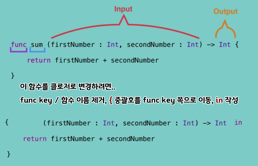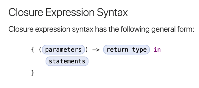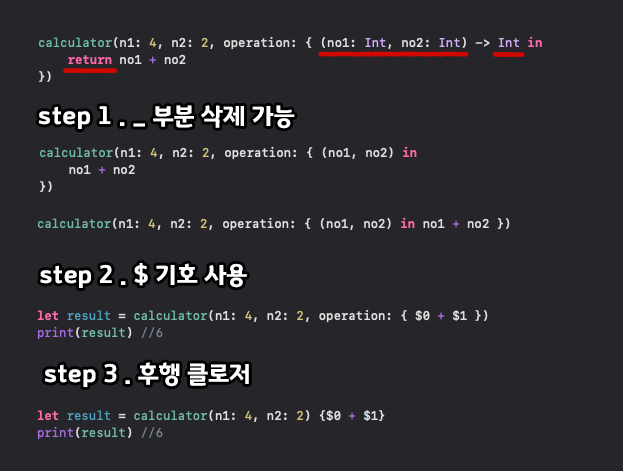 유형 추론을 사용하여 입력값을 지우거나, $ 기호를 사용하여 극단적으로 코드를 줄일 수 있다. 또 클로저 이름을 삭제하고 후행 클로저를 사용하여 줄일 수 도 있다.