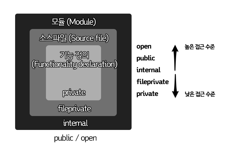 접근제어는 접근수준 키워드를 통해 구현이 가능하다. 클래스, 구조체, 열거형등에 특정 접근수준을 지정할 수 있으며, 메서드, 이니셜 라이저, 서브 스크립트, 프로퍼티 각각에 접근수준을 지정할 수 있다.