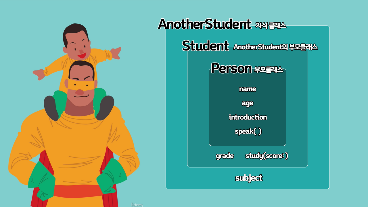 더불어 Student(자식클래스)를 상속받는 또 다른 클래스를 만들 수 있다. 즉, Student가 다른 클래스의 부모 클래스가 될 수 있다.