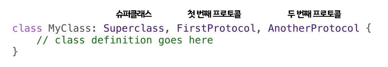 만약 슈퍼클래스를 상속하고 있을 때는 순서가 중요하다. 슈퍼클래스 ➜ 첫 번째 프로토콜 ➜ 또 다른 프로토콜
