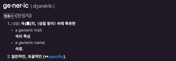 일반적인, 포괄적이라는 뜻인데... Apple에 의하면 제네릭을 사용해 코드를 구현하면, 아주 유연하고 재사용성 높은 코드를 작성할 수 있다고 한다. 또, 제네릭으로 구현한 기능과 타입은 재사용하기도 쉽고, 중복을 줄일 수 있기 때문에 깔끔하고 추상적인 표현이 가능하다.