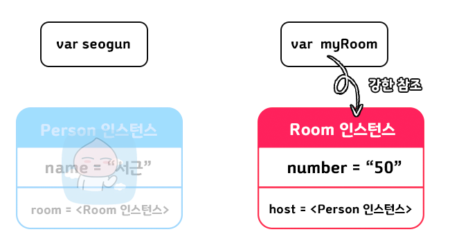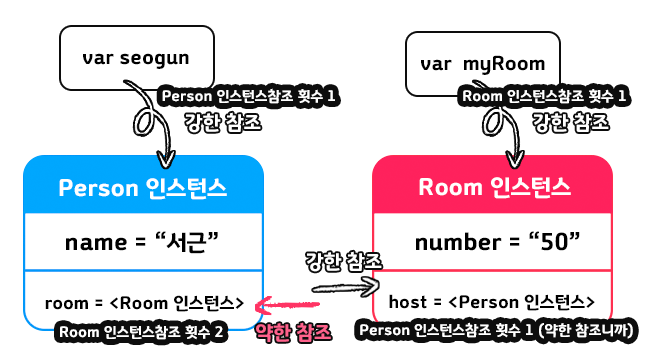myRoom?.host = seogun // Person 인스턴스의 참조 횟수 : 2