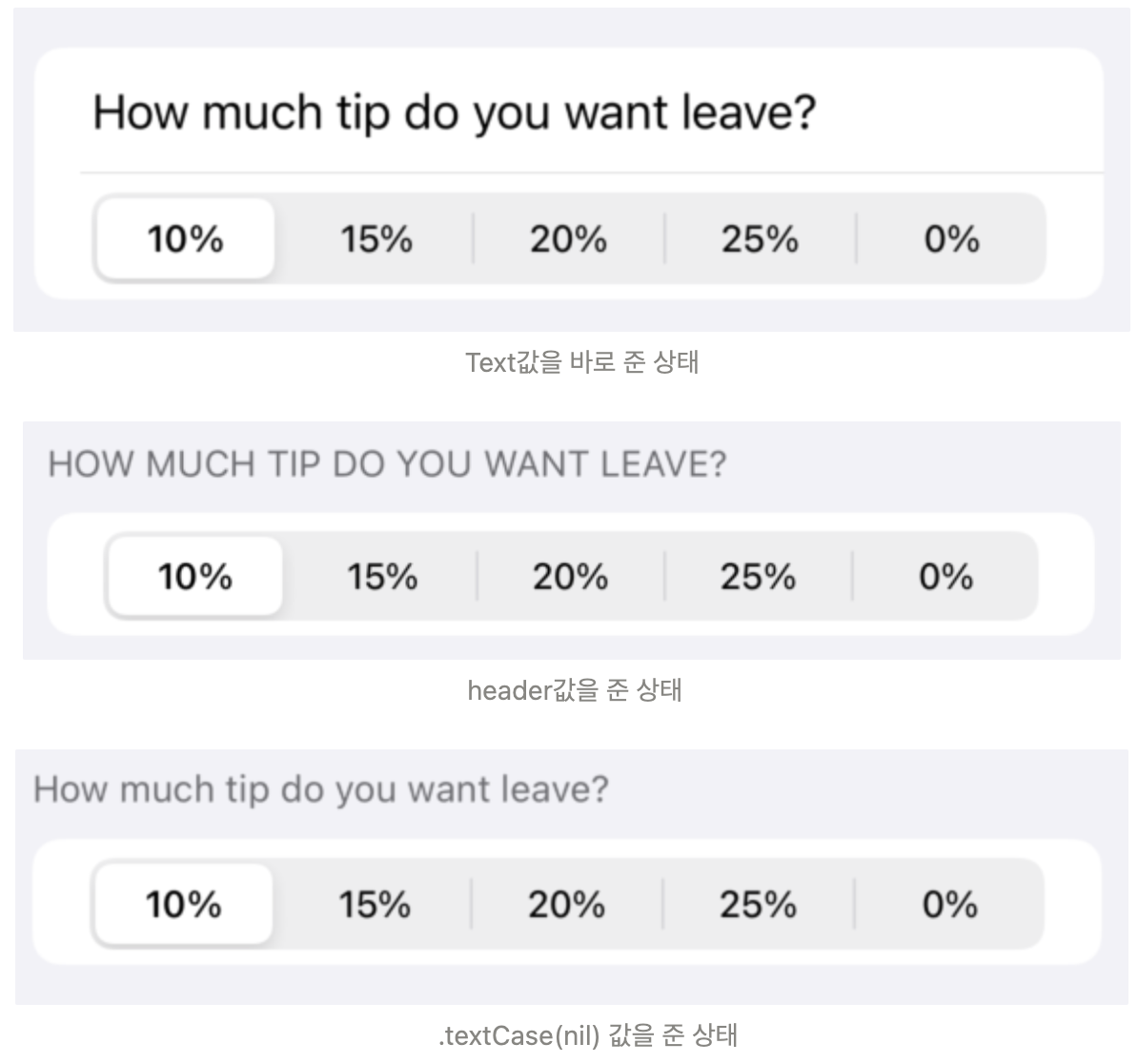 위 스크린샷에서 확인했듯이, header 값만 주면 전체가 다 대문자로 표시되게 되는데, 이를 수정하려면 Section이 끝나는 아래쪽에 textCase(nil)을 넣어주면 됩니다. 아래 전체 코드로 확인해보세요 :)