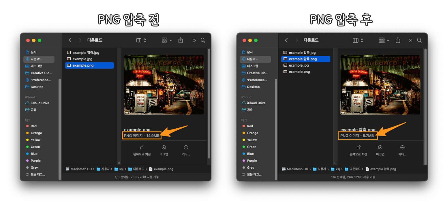 위의 JPG(2.3MB)를 PNG 형식으로 바꾸면 약 14.9MB로 용량이 엄청 커지게 됩니다. 그리고 이 PNG 파일을 압축하면