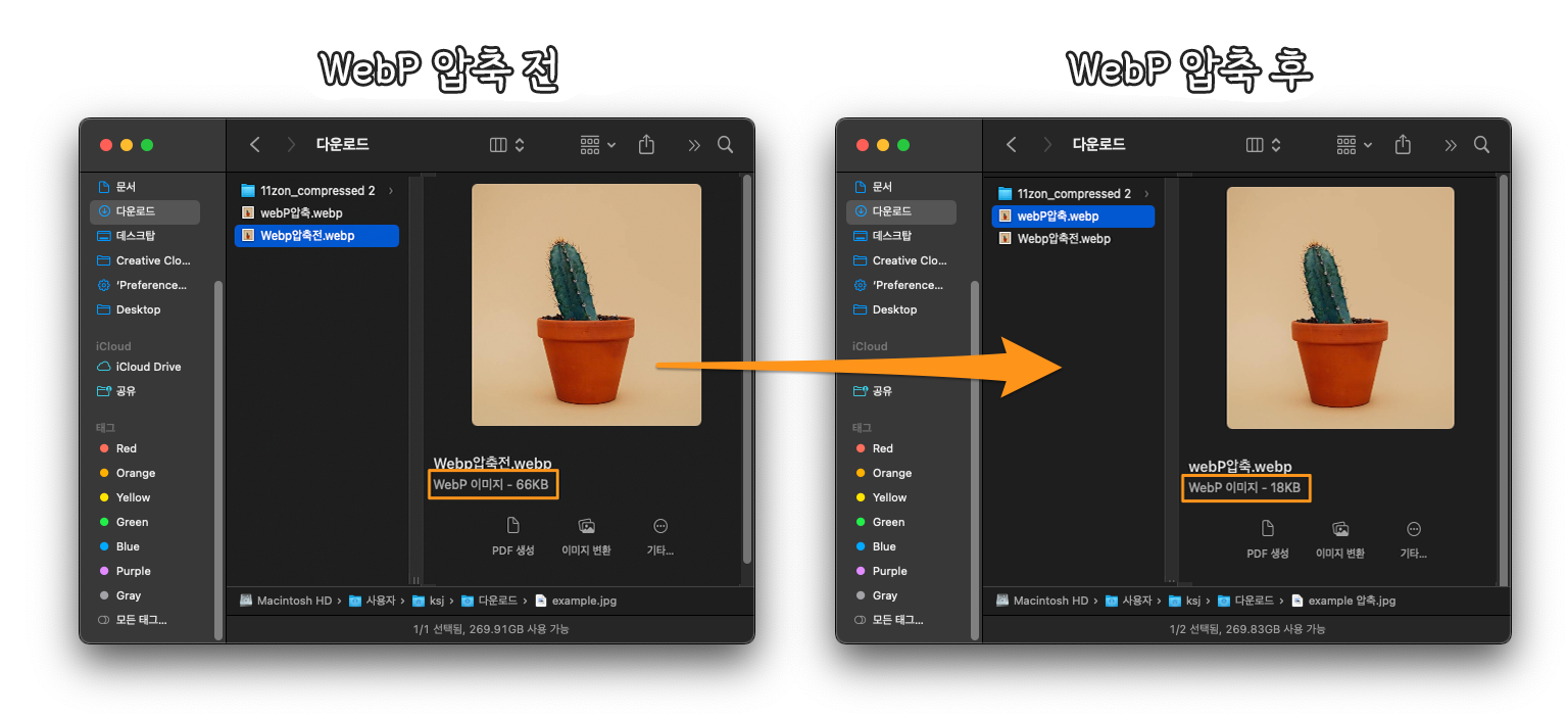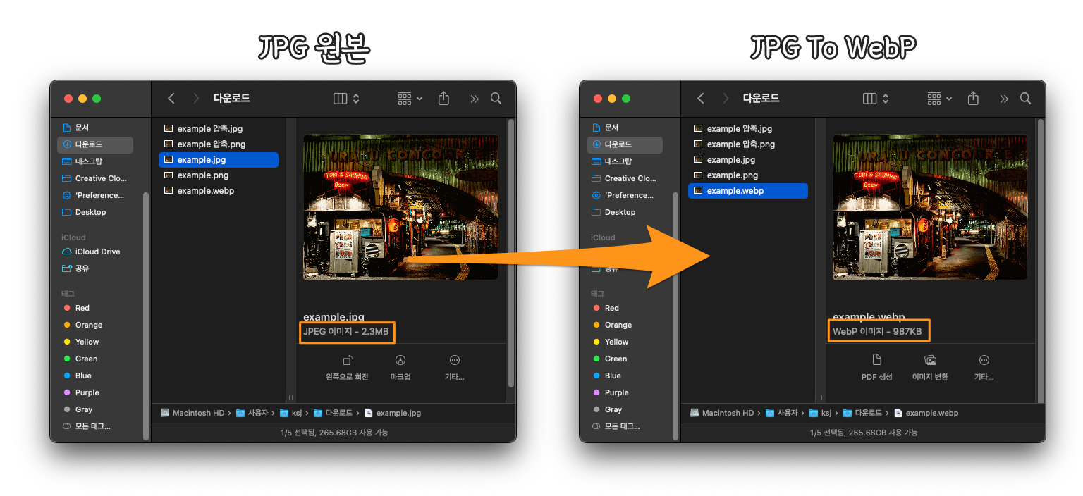 JPG(2.2MB) ➜ WebP(987KB)로 크게 압축이 되는 것을 확인할 수 있습니다.