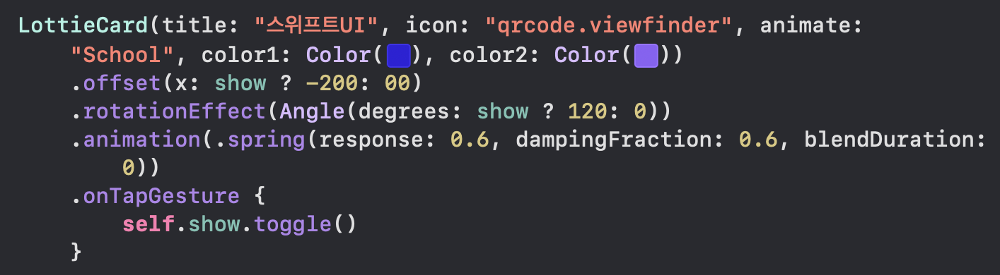 LottieCard(title: "스위프트UI", icon: "qrcode.viewfinder", animate: "School", color1: Color(literal), color2: Color(literal)