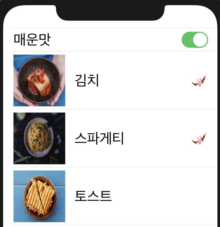 이제 토글이 작동이 됩니다. 하지만 이미지에는 아무런 변화가 없죠. 자, 만약 토글을 off했을때 맵지않은 음식을 가리고 싶다면?
