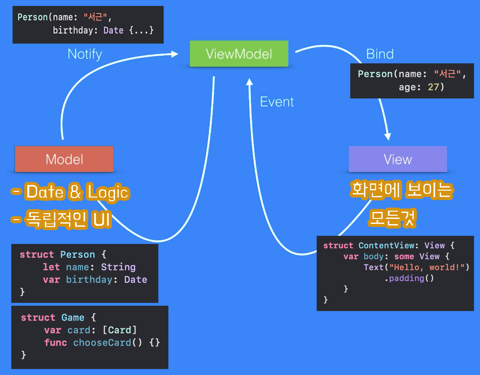 새로운 Xcode 프로젝트를 생성하여 시작하도록 하겠습니다. 일반적으로 아래와 같이 생성하게 되면 Model 👉🏻 View 로 직접적으로 화면을 구성해주게 됩니다. 아래 코드를 보면 age가 Int로 정해져있습니다.