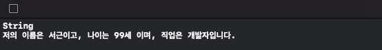 print("저의 이름은 \(name)이고, 나이는 \(age)세 이며, 직업은 \(job)입니다.")