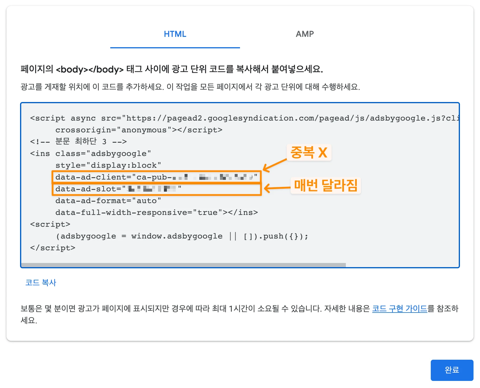 data-ad-client는 애드센스 고유 넘버이기 때문에 한 번만 사용하면 되지만, data-ad-slot은 광고를 생성할 때마다 새로운 번호가 생성되기 때문에 두 개를 복사해 두셔야 합니다.