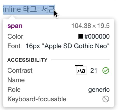 Inline 태그는 필요한 만큼만 너비를 차지합니다. 대표적으로 <span> 태그가 많이 쓰입니다.
