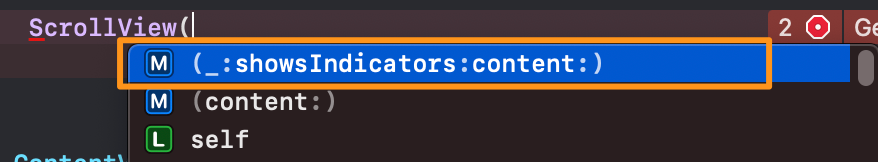 ScrollView코드를 작성 후 괄호()를 열어보면 아래와 같이 스니팻 목록이 나오게 됩니다.