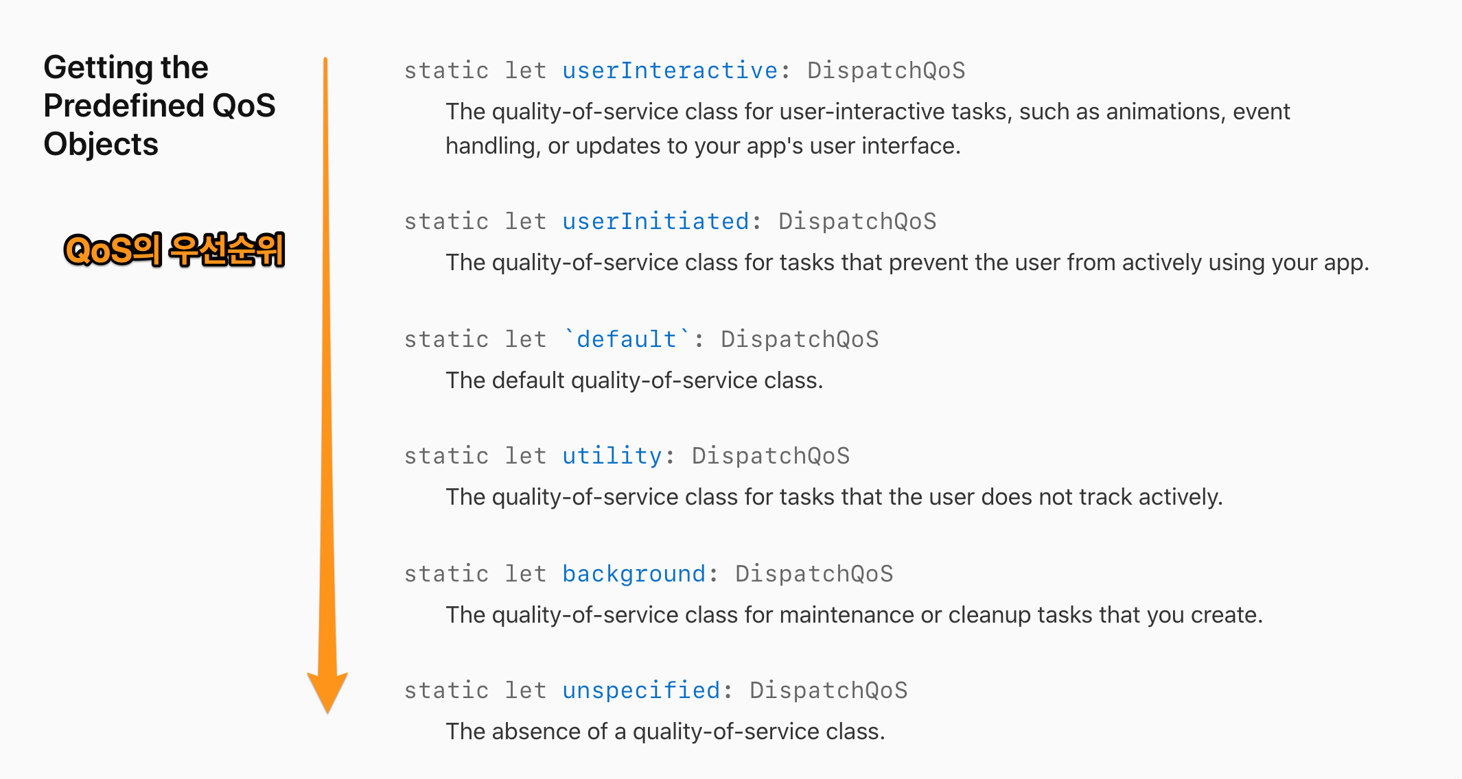 DispatchQueue.global(qos: .background) {} //눈에 보이지 않는 부분의 작업. 완료 시간 중요X
