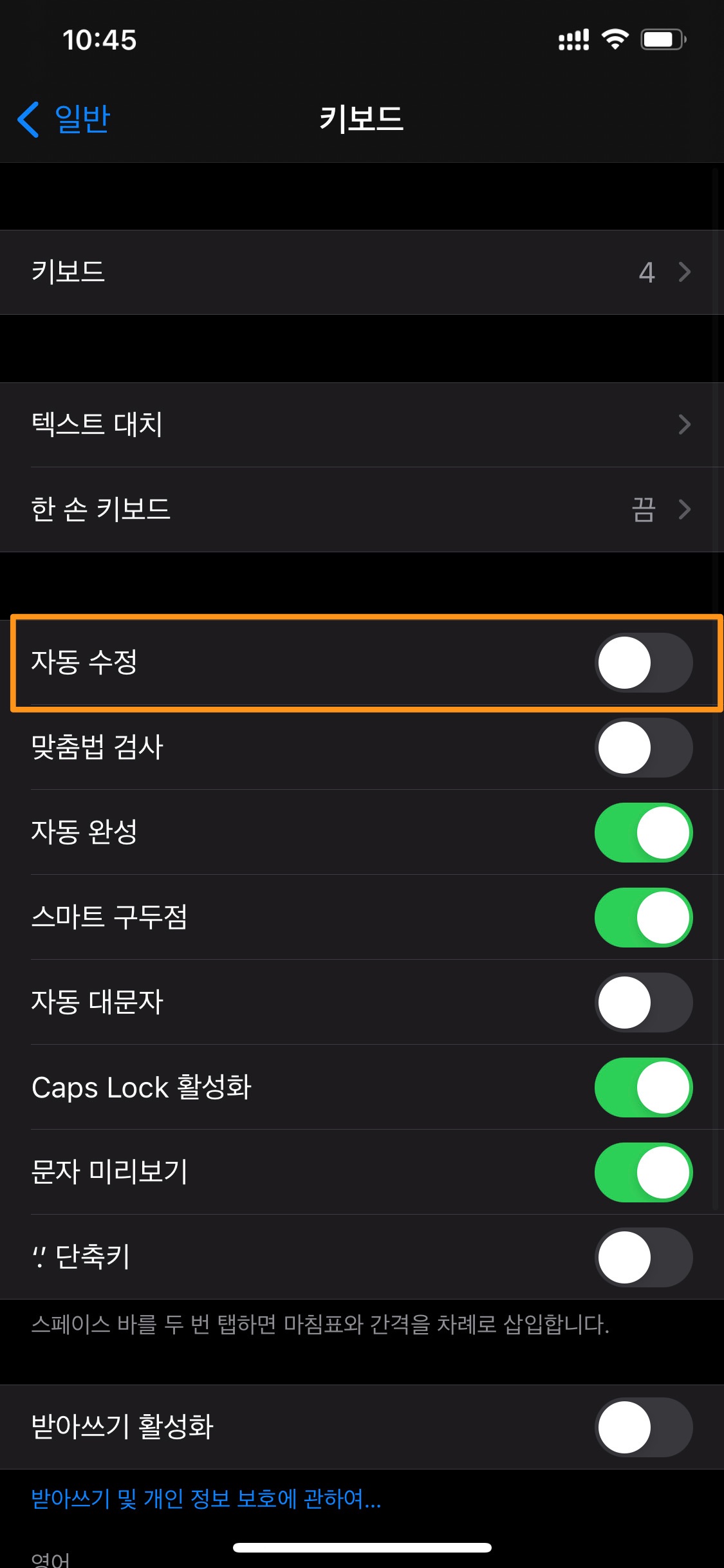 키보드 옵션의 자동 수정이 off 이면 autocorrection을 Yes로 해놔도 설정에서 off를 했기 때문에 이 Yes가 무시된다.