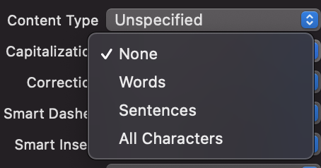 대문자와 관련된 프로퍼티. 일부 키보드 타입은 auto-capitalization을 지원하지 않는다. 특히 keyboardType프로퍼티의 값이 numberPad, phonePad, namePhonePad로 설정된 경우, 이 옵션은 무시됨.