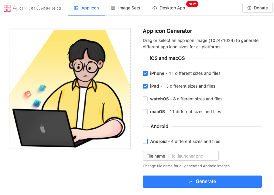 본인이 원하는 앱아이콘 파일을 준비하고 아래 사이트에서 iOS 전용 아이콘으로 변환 할 수 있다.