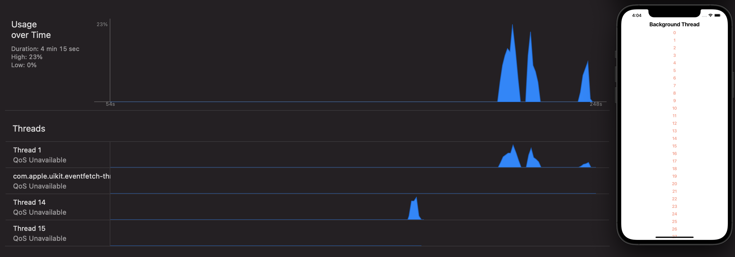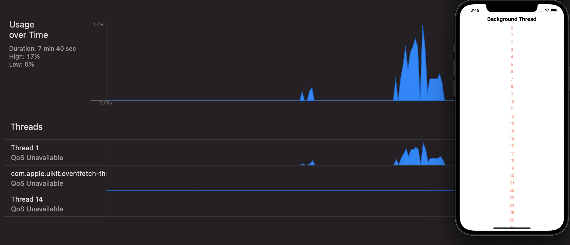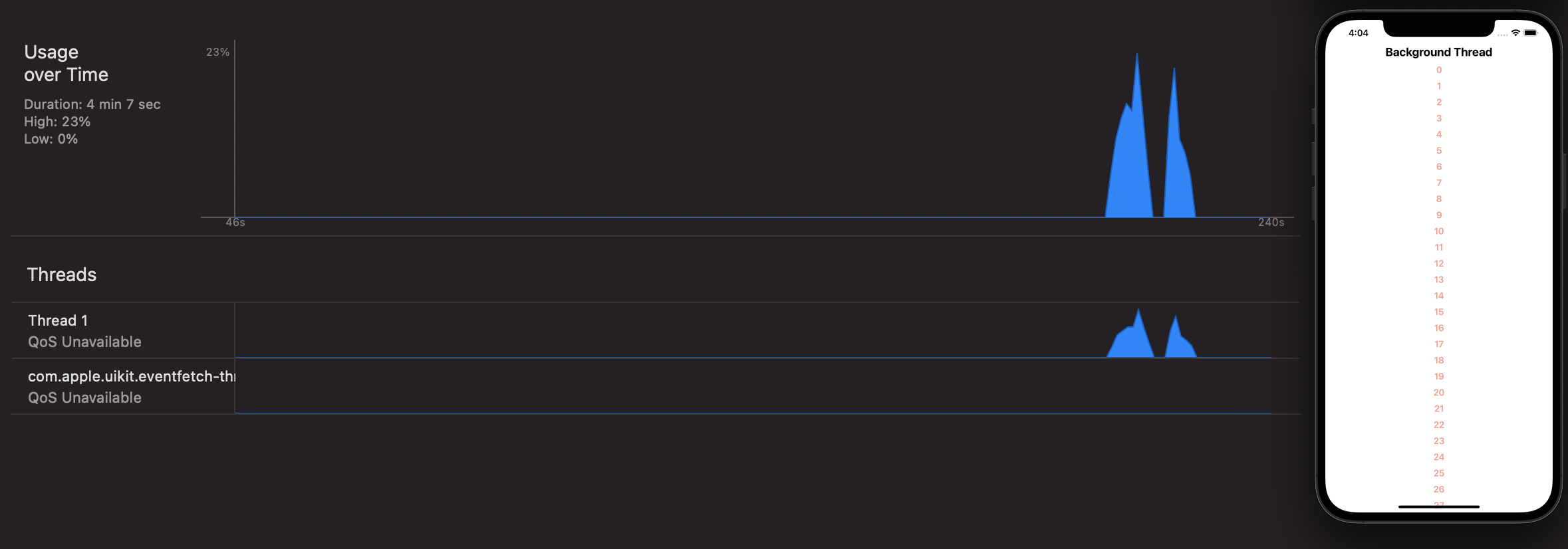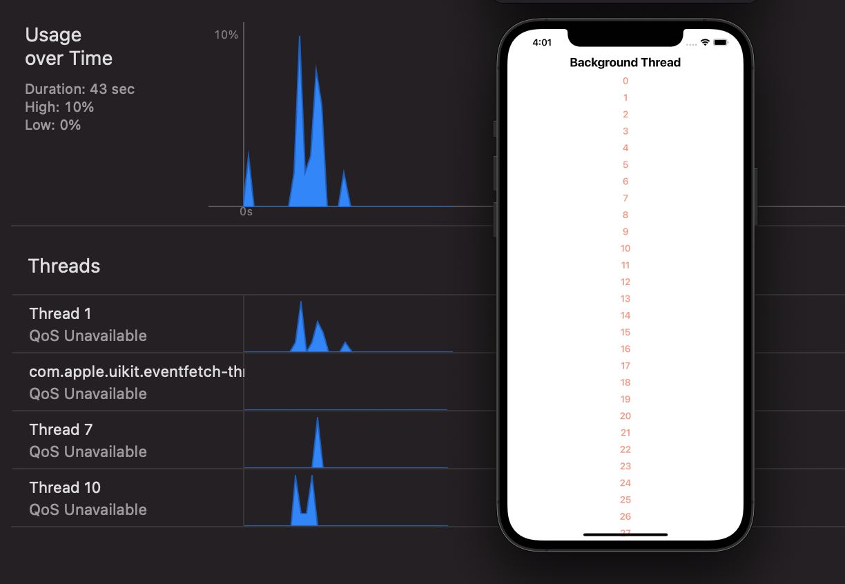 아래 Threads탭을 보면 지금은 Thread1과 Thread4가 존재합니다. 여기서 Thread1이 Main Thread입니다. 작성하는 모든 코드가 Thread1에서 실행됩니다. 만약 시뮬레이터에서 텍스트를 탭 해보면 스파이크가 생기고 스크롤을 하면 다시 한번 Main Thread의 변화를 확인할 수 있습니다.