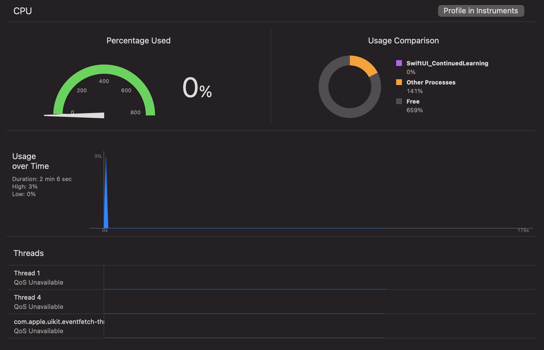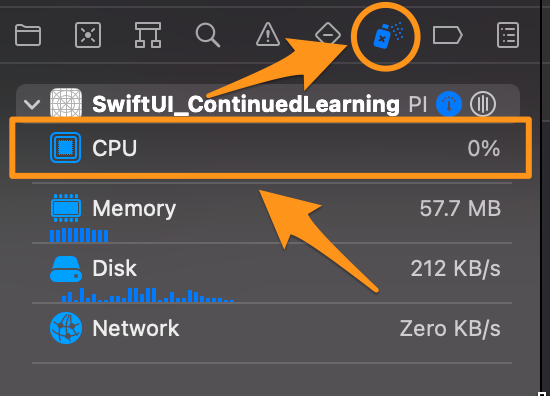 Percentage Used화면을 보면 지금은 0%로 나와 있지만 복잡하고 큰 데이터를 가지고 있는 앱을 구축하려면 반드시 이 CPU를 확인해야 합니다. 아래 막대가 빨간색이면 CPU가 높은지 확인해야 하죠. 만약 CPU가 높다면 이것을 해결할 수 있는 방법이 바로 Background Thread 또는 여러 Thread를 사용하는 것입니다.