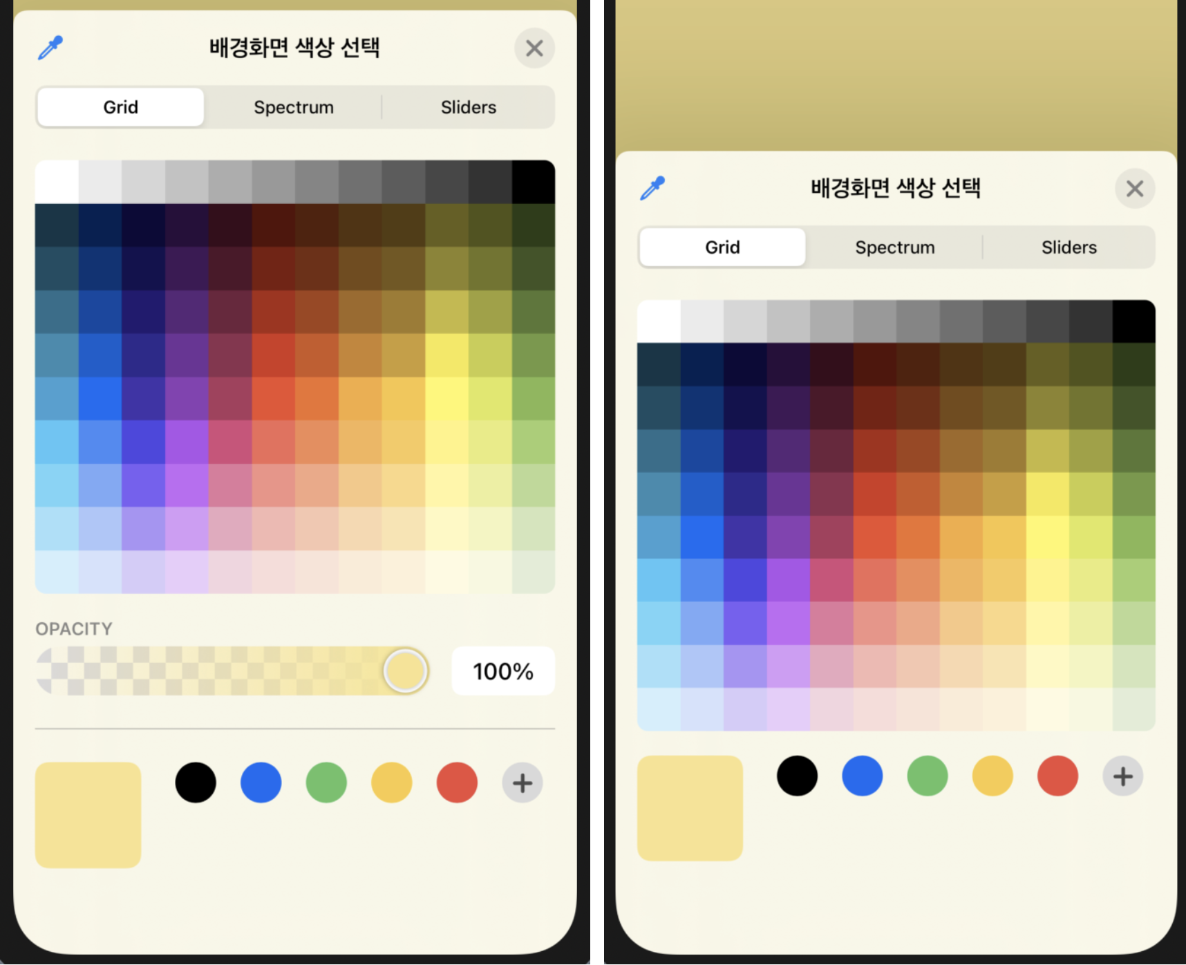 ColorPicker는 현재 선택한 색상을 표시하는 색상저장소를 제공하고, 사용자가 새로운 색상을 선택할 수 있도록 더 큰 팔레트를 표시합니다. 기본적으로 ColorPicker는 불투명한 색상을 지원합니다. 하지만 불투명도를 비활성화 하려면 매개 별수를 설정해야합니다.