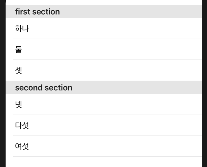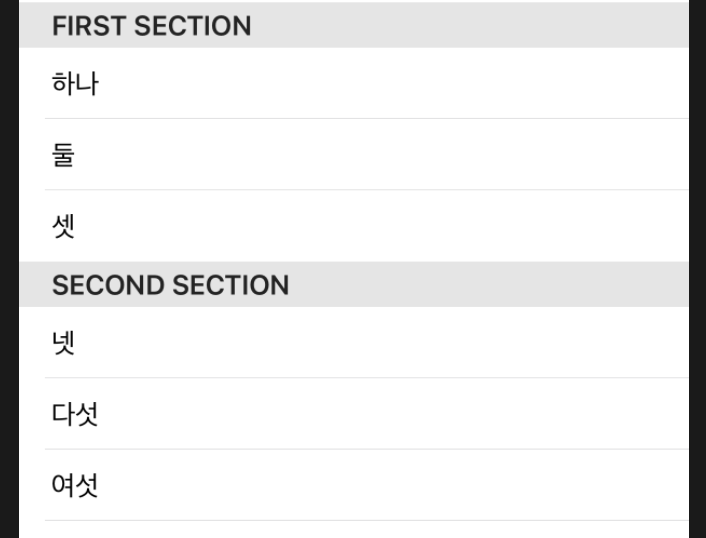 위 결과 화면을 보면 Section부분 Header Text에 소문자로 "first section"으로 지정해주었지만, 실제 결괏값은 대문자로 나와있는 것을 확인하실 수 있습니다. 이럴 때는 .textCase(nil)값을 Section밖에 추가하면 실제 사용자가 정해놓은 텍스트 값으로 보여주게 됩니다.