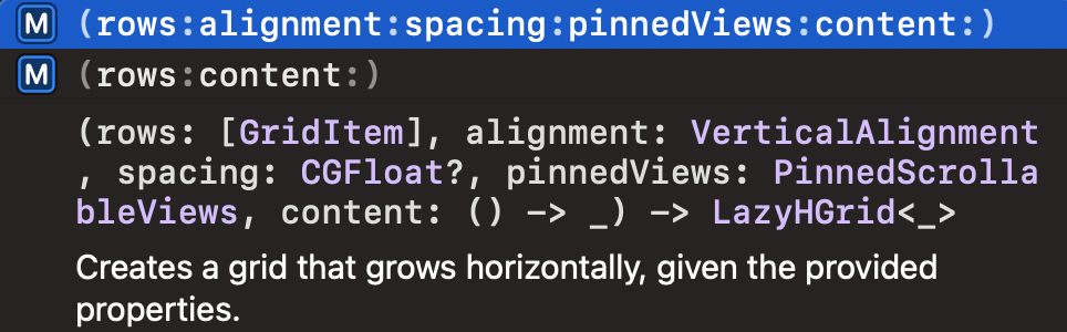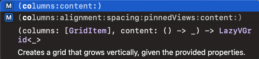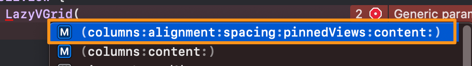 이 단계에서 알아야 할 것은 LazyVGrid입니다. LazyVGrid를 작성해보면 자동으로 어떻게 사용해야 할지 아래 사진과 같이 나오게 됩니다.