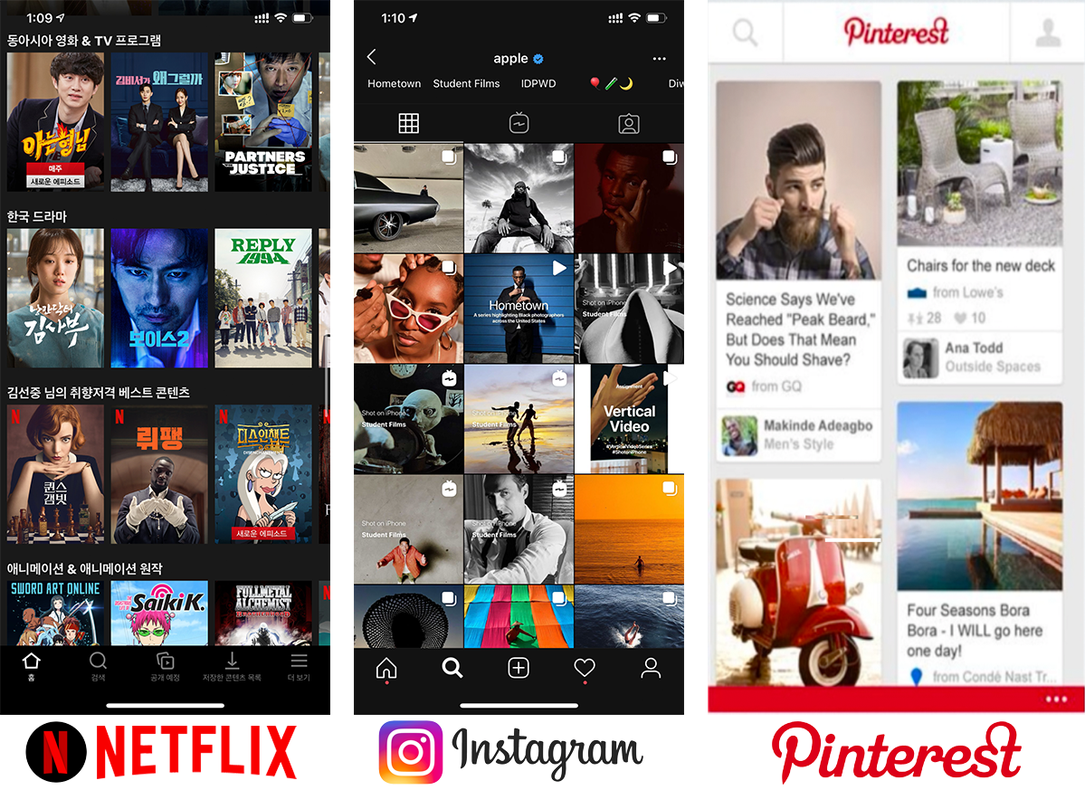 가장 좋은 예로 Instargram / Pinterest / Netflix 의 레이아웃을 떠올리시면 됩니다.