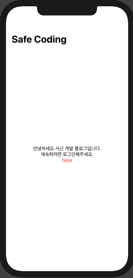 프리뷰를 실행해보면 당연시 currentID가 nil이기 때문에 화면에 "계속하려면 로그인해주세요."라는 문구가 뜹니다. 그럼 만약 nil이 아닌 값을 부여해준다면 어떨까요?