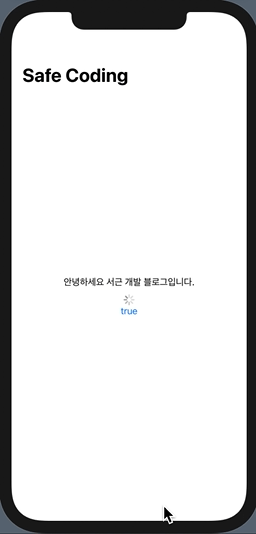 이 코드는 프리뷰가 실행되면 ProgressView가 실행되고 3초 후에 "빡코딩 합시다!"라는 문구가 나오게 됩니다. 함수에 isLoading을 true로 넣어 줬고 title이 나오면 다시 isLoading을 false로 설정해줬습니다.