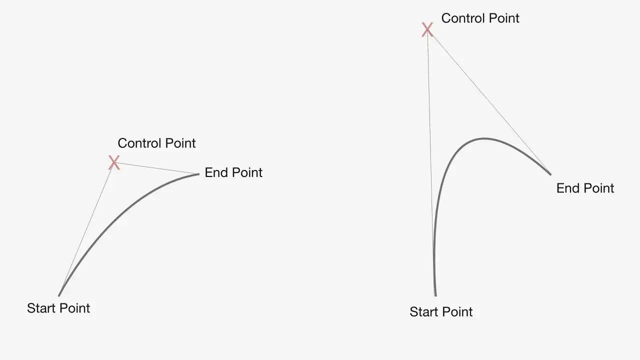 곡선의 방향과 강도는 해당 Control Point을 배치하는 위치에 따라 달라집니다. Control Point을 더 멀리 배치할수록 곡선이 더 많이 구부러지게 되는 것이죠.