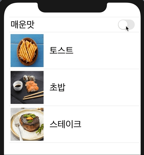struct ContentView: View { var model = Dish.all() //9. @State private var IsSpicy = false var body: some View { List { //10 .constant(true) -> $IsSpicy Toggle(isOn: $IsSpicy) { Text("매운맛")