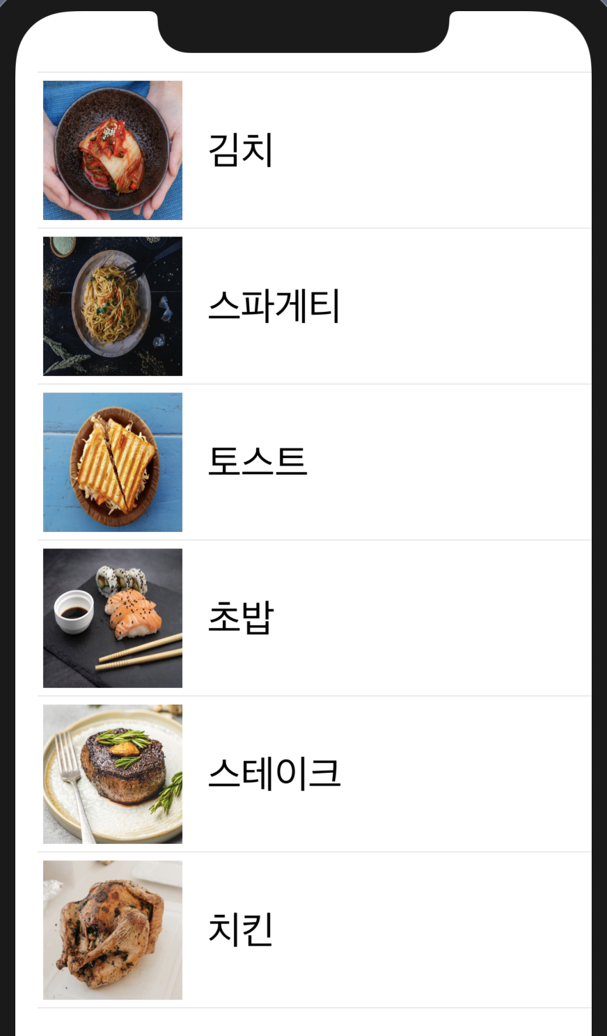에 화면을 구성해보도록 하겠습니다. 우리는 음식 이미지와 이름을 나열하고 만약 그 음식이 매우면, 맵기를 표시하려고 합니다.