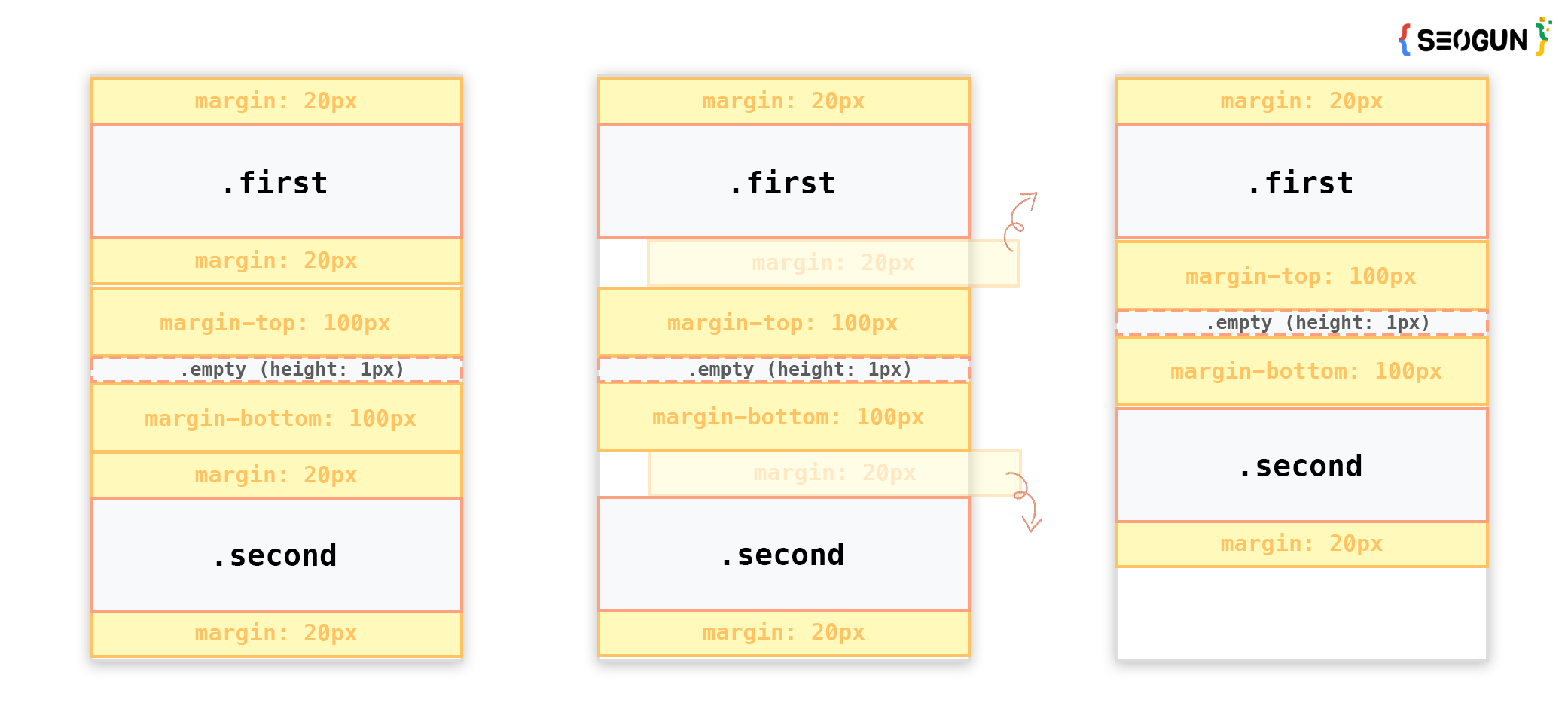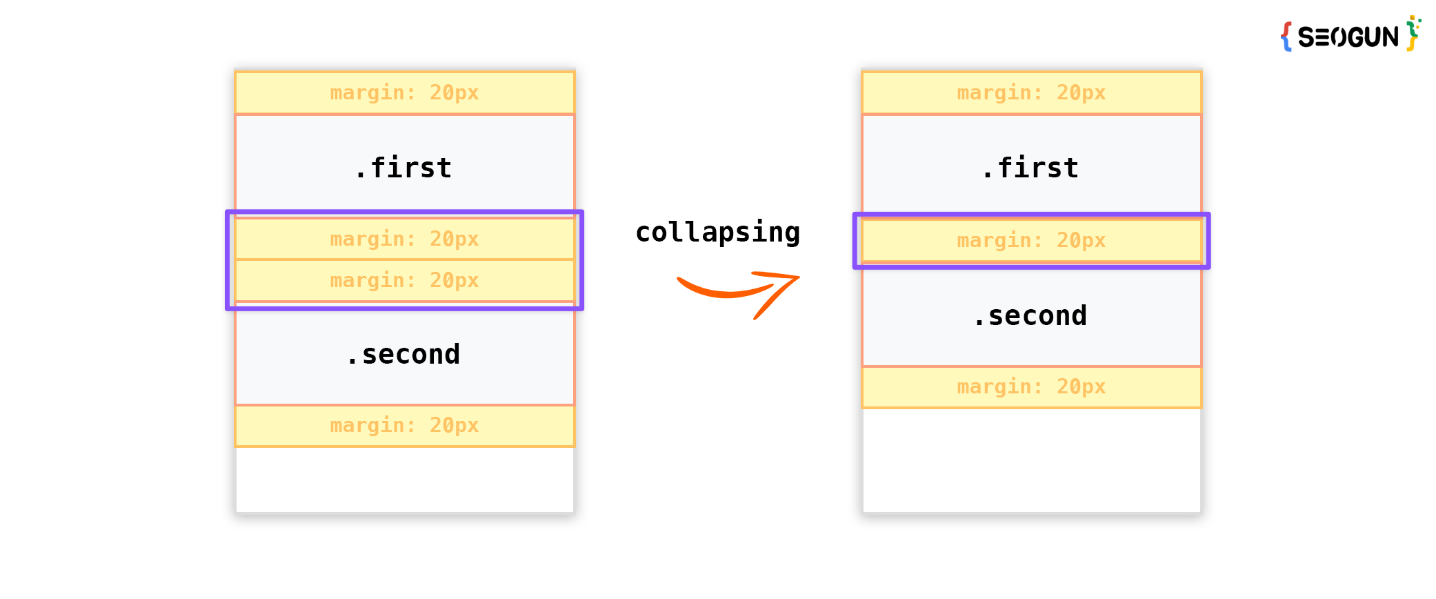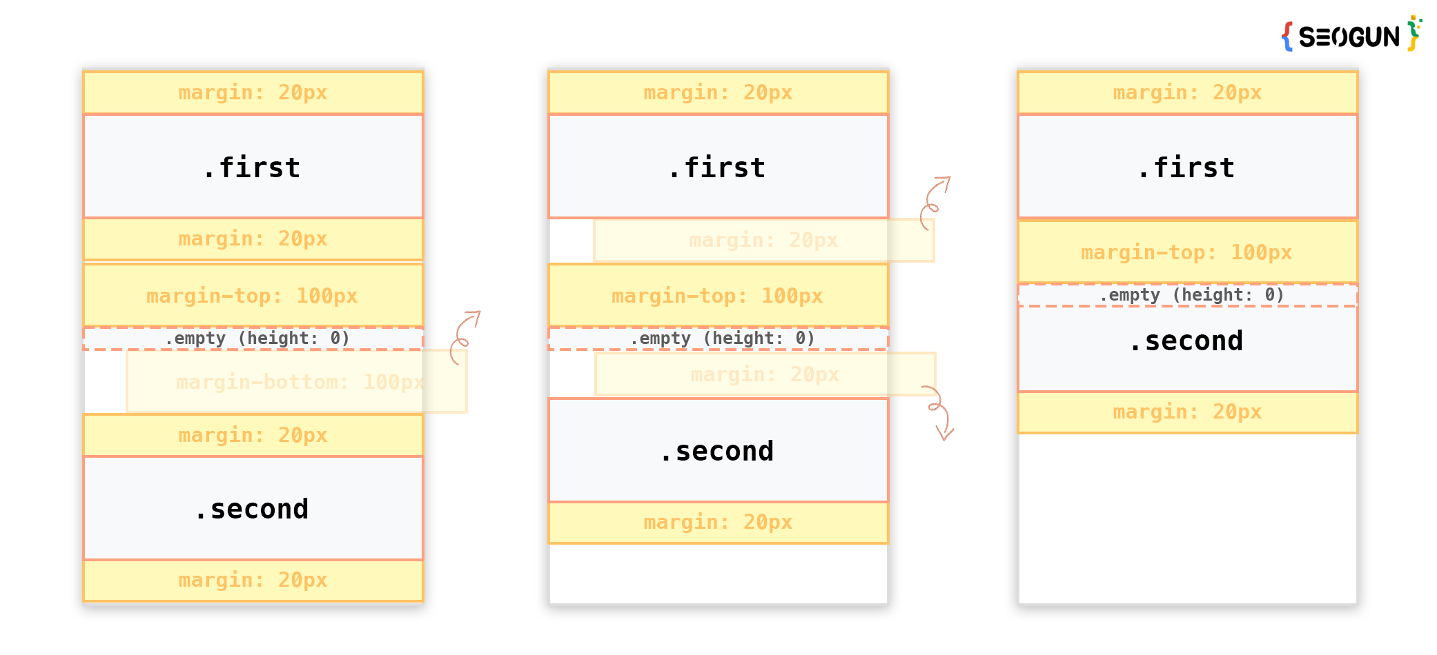 위 코드를 보면 .first와 .second 클래스 모두 margin: 20px 0; 을 적용시켜 주었습니다. 하지만 결과를 보면 각 요소의 최상단과 최하단을 제외한 중복된 마진 20px이 상쇄된 것을 알 수 있습니다.