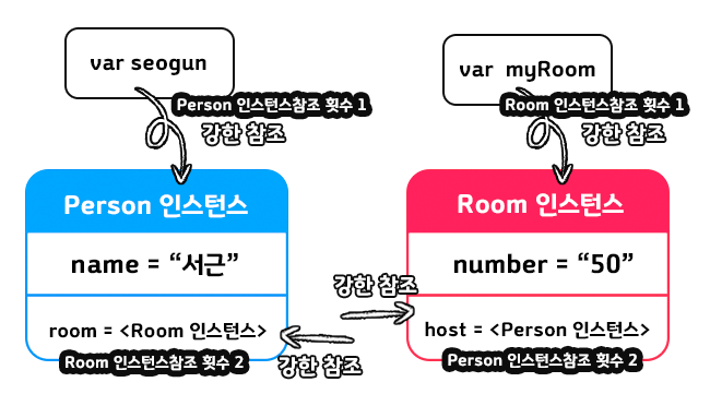 myRoom?.host = seogun // Person 인스턴스의 참조 횟수 : 2