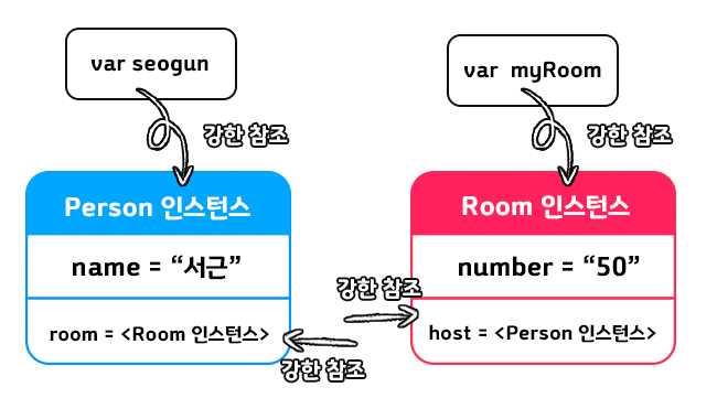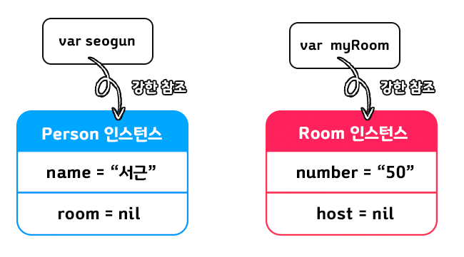 Person의 인스턴스는 Room인스턴스에 대해 강한 참조를 가지게 되었고, Room의 인스턴스는 Person인스턴스에 대해 강한 참조를 가지게 되어 두 인스턴스 사이에 강한 참조 사이클이 생성됐다.