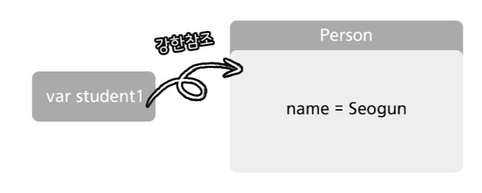 만약 student1이 가지고 있는 참조를 해제하면 student1이 가지고 있었던 참조를 해제하면서 Person 인스턴스는 어떠한 참조도 가지고 있지 않게 되며 디이니셜라이저가 호출된다.