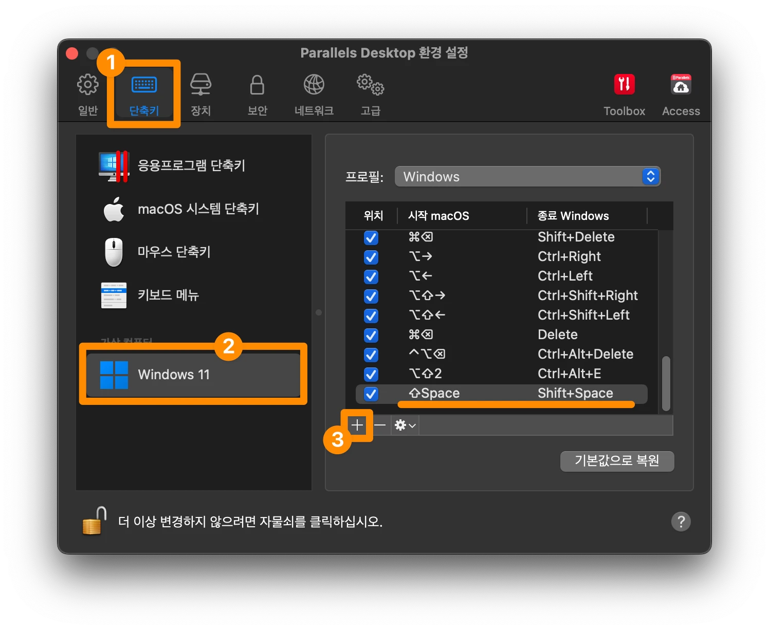 윈도우11에서 키보드 언어를 변경할 때 shift +space 를 눌러 변경하는데, 이 단축키를 맥북 패러렐즈 18에도 추가하고 싶다면 아래와 같이 진행하면 됩니다.
